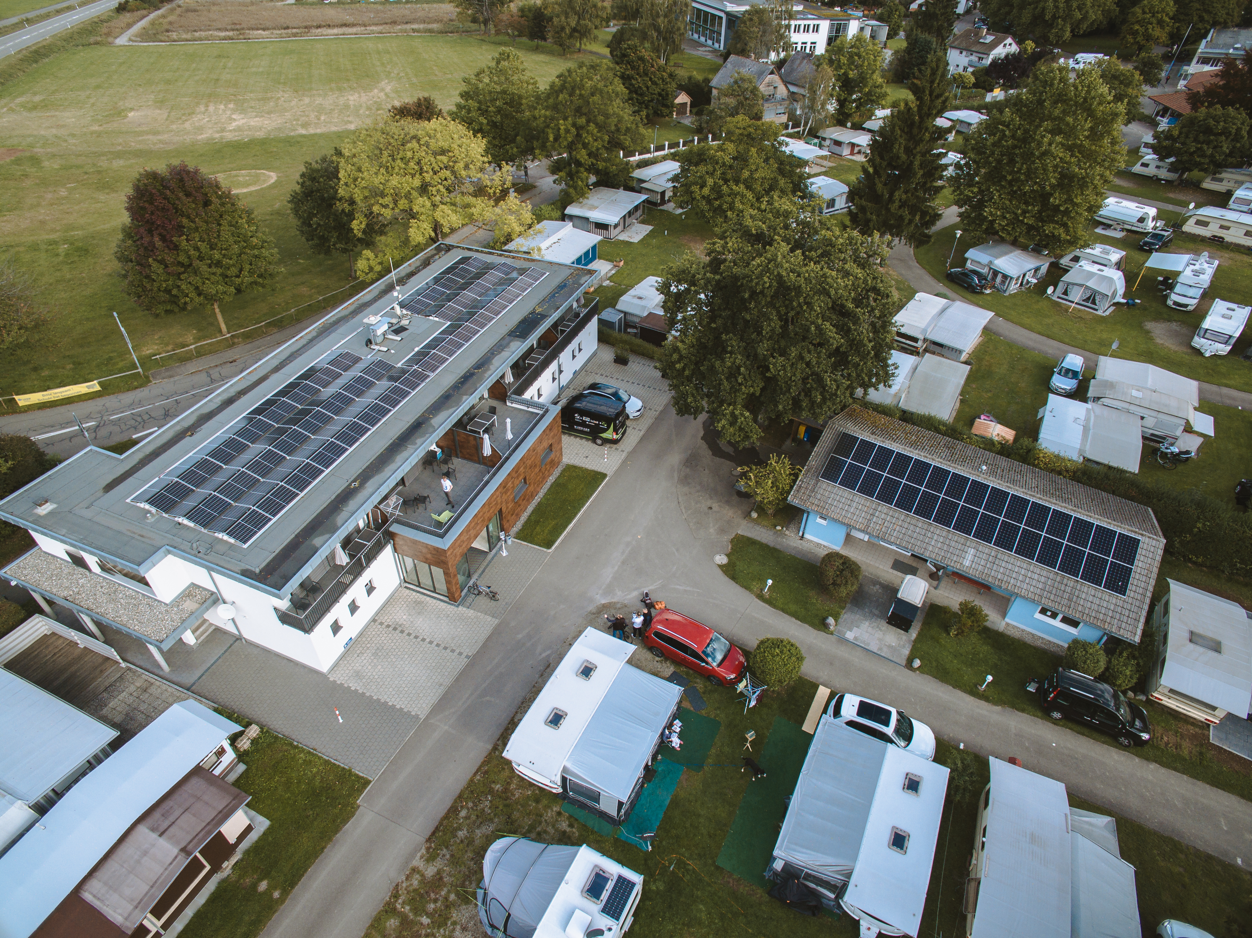 Auf dem Campingplatz in Kirchzarten betreibt die ewk zwei Photovoltaikanlagen auf bislang ungenutzten Dächern. Ende letzten Jahres ging die zweite Anlage in Betrieb. Die beiden Anlagen werden je nach Wetter pro Jahr zwischen 31.200 – 39.000 Kilowattstunden regenerativen Strom aus der Sonne erzeugen. Das entspricht dem durchschnittlichen Stromverbrauch von circa zehn Dreipersonenhaushalten.